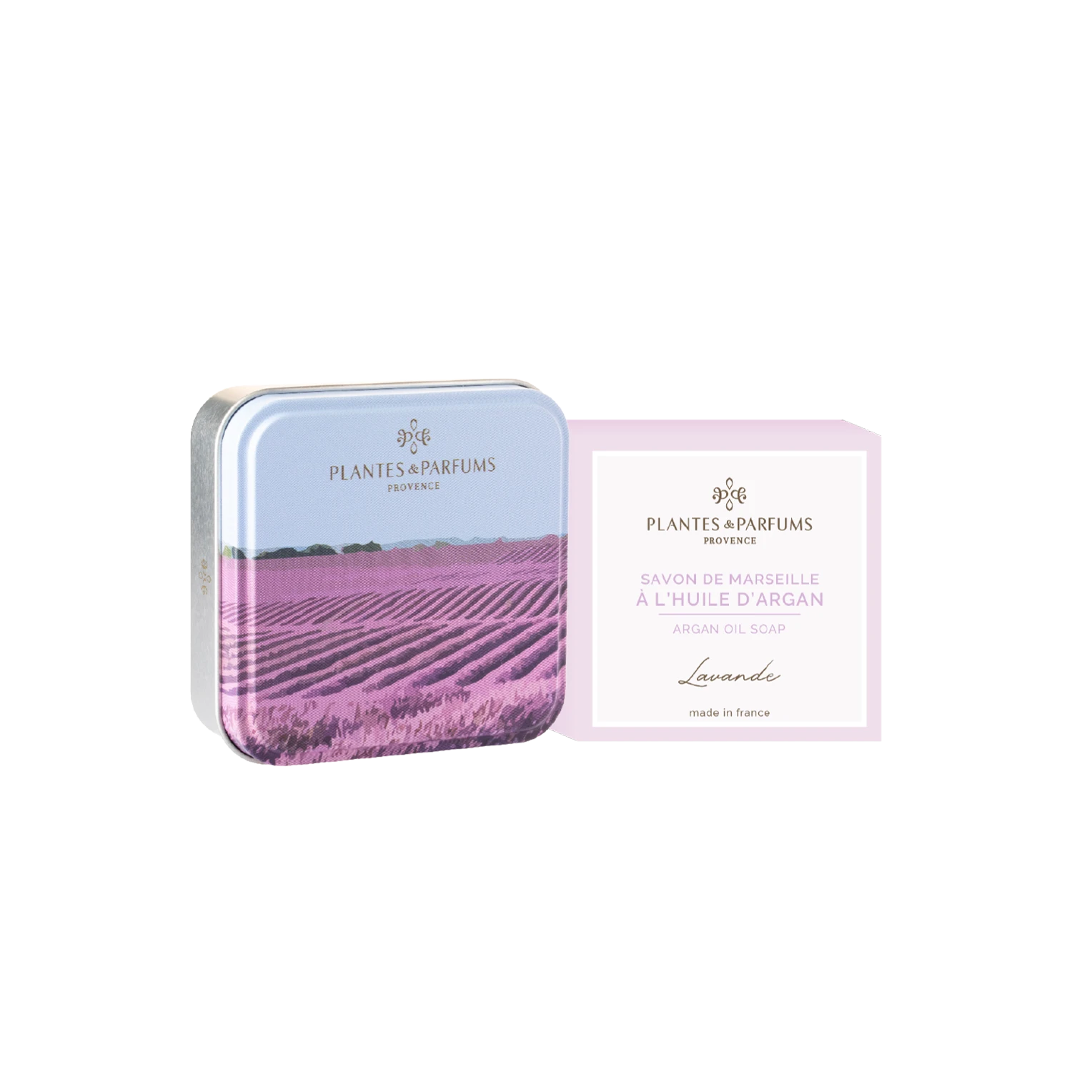 Cette Boîte Métal, au décor doux et délicat, est composée d’un Savon Parfumé à la Lavande.