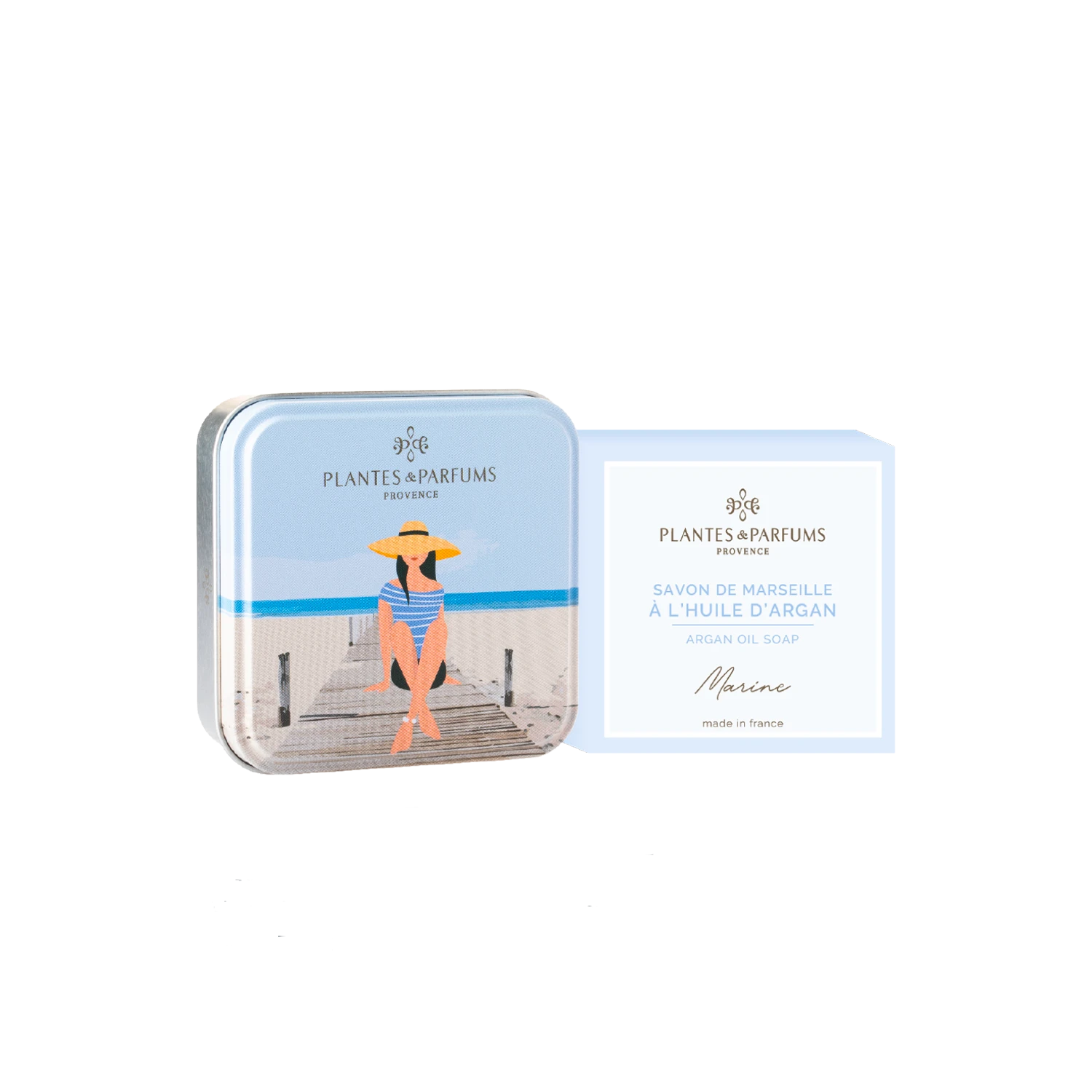 Cette Boîte Métal, au décor doux et délicat, est composée d’un Savon Parfumé Marine 100g.