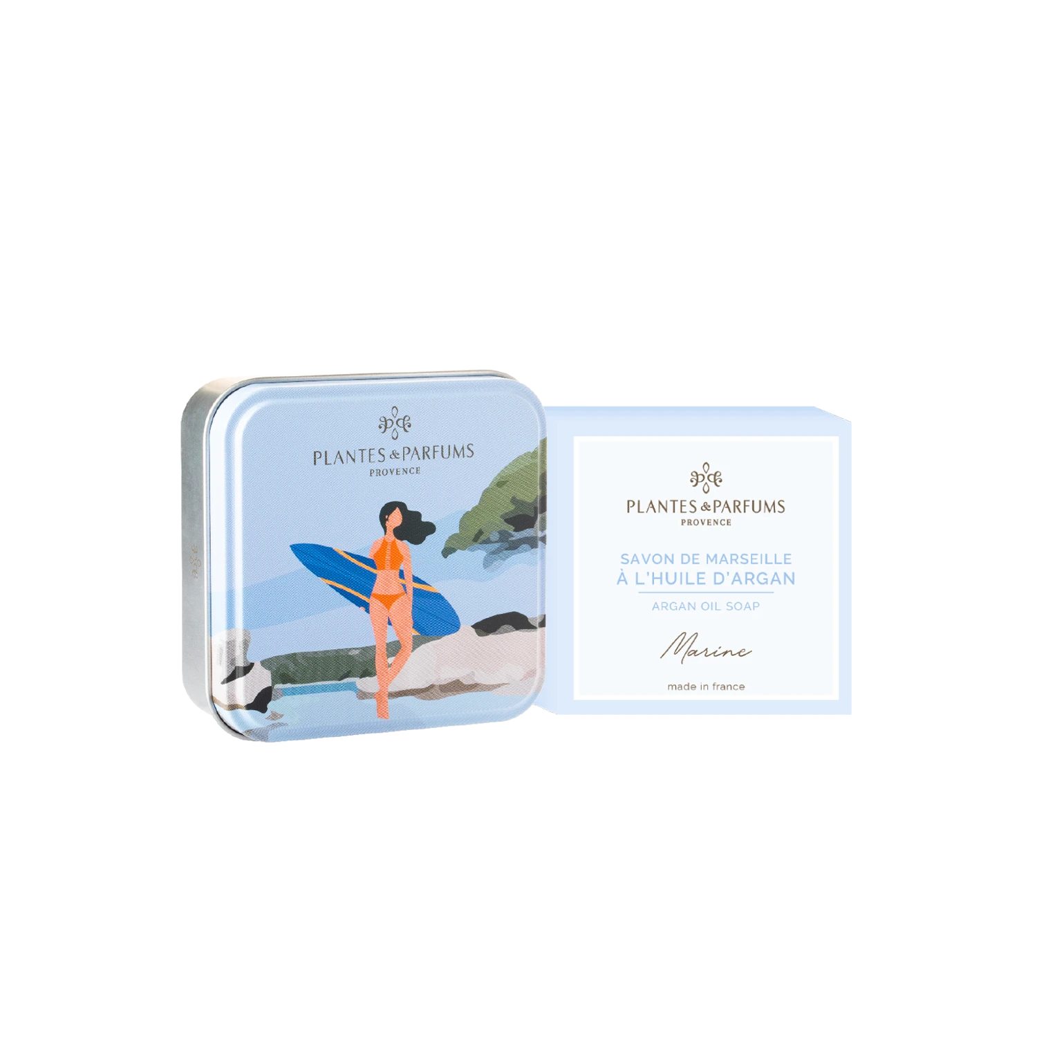 Cette Boîte Métal, au décor doux et délicat, est composée d’un Savon Parfumé Marine 100g.